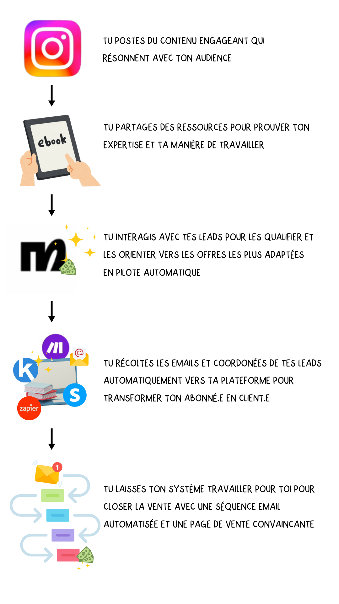 Pour t'aider à attirer des personnes qualifiées vers tes offres, relancer tes prospects automatiquement, humainement et vendre en douceur, pour que chaque contenu que tu crées compte vraiment, pour enfin construire des bases saines et solides pour ton business.